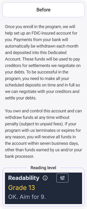 • Lowered the reading grade level for each main section so it’s easier to understand, especially considering accessibility guidelines and users who speak English as a second language