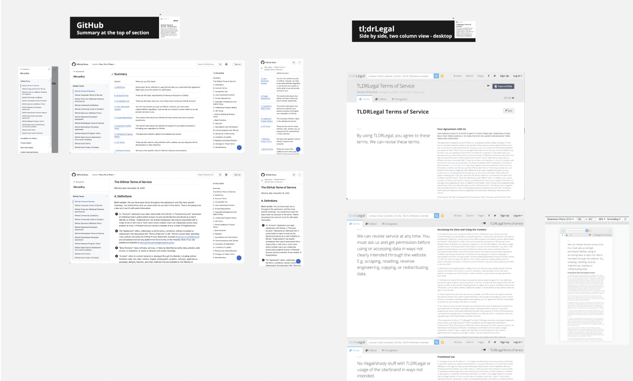 • Put together a Miro board of different terms pages from 8 companies like Pinterest, GitHub, and Airbnb to determine different ways to structure and clarify information on Terms pages
