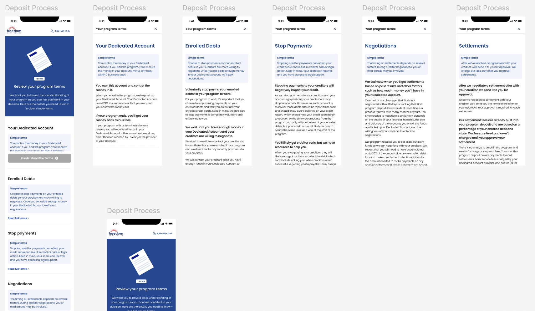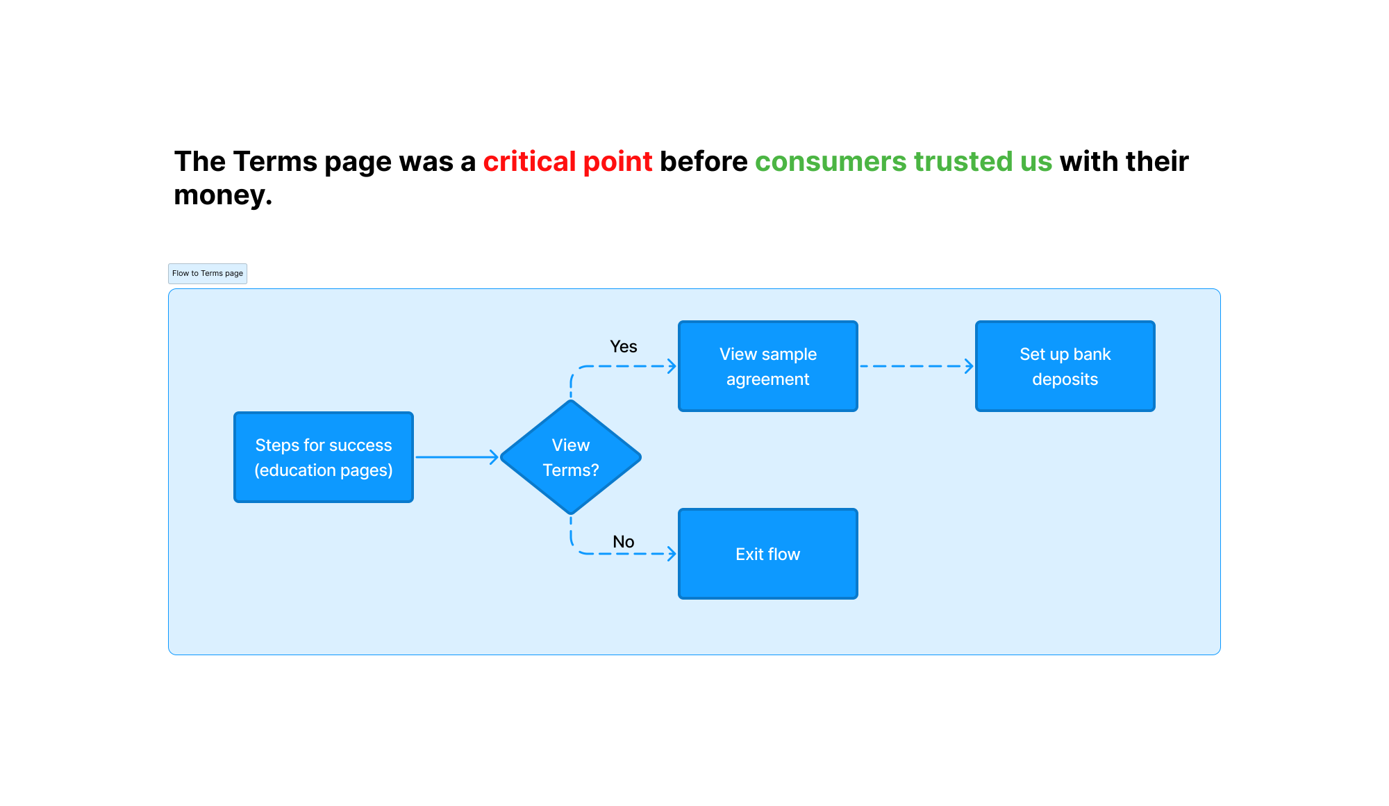 • The Terms page was critical because users saw it before entering their bank information so trust and understanding were big factors to moving forward.