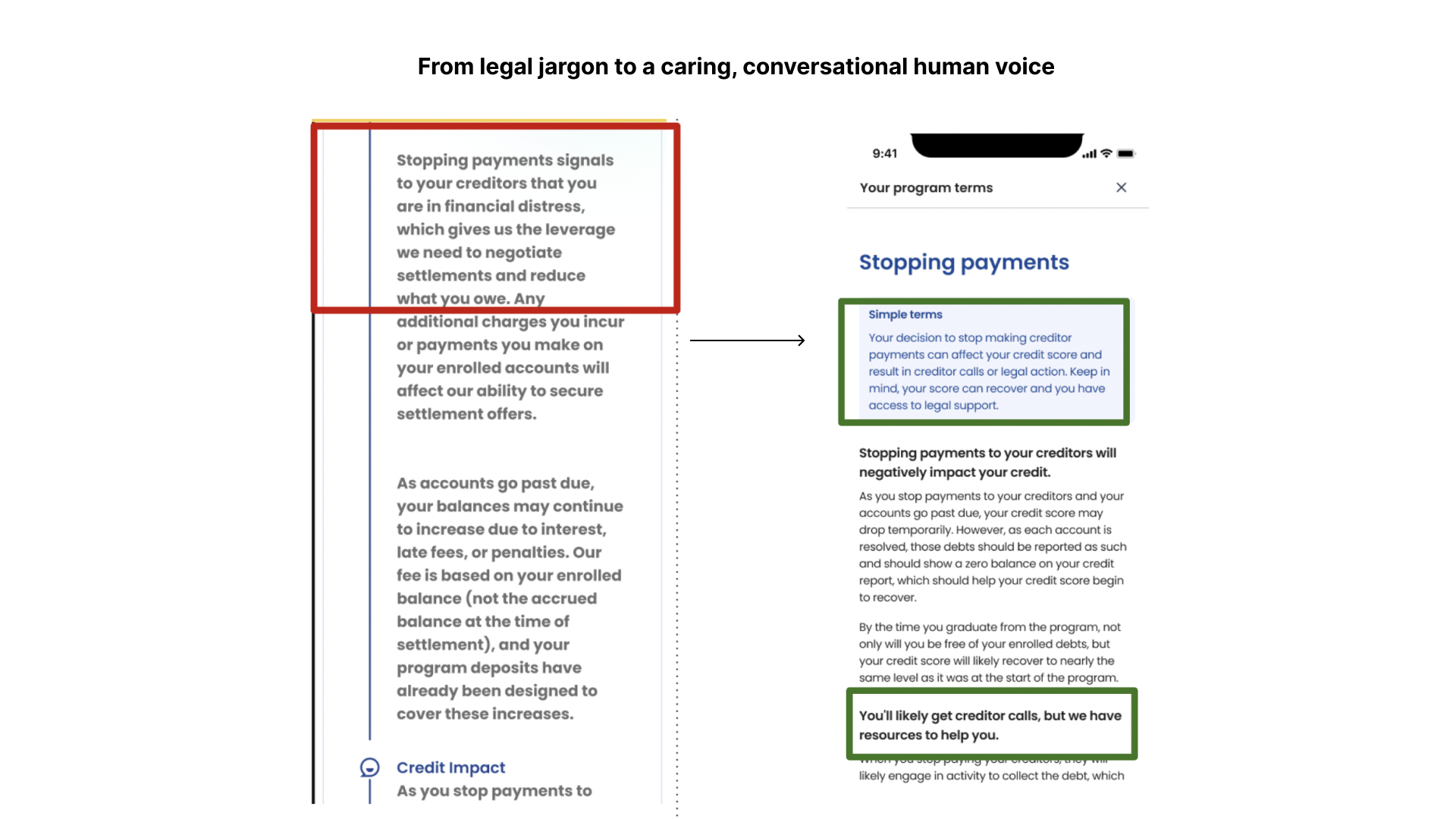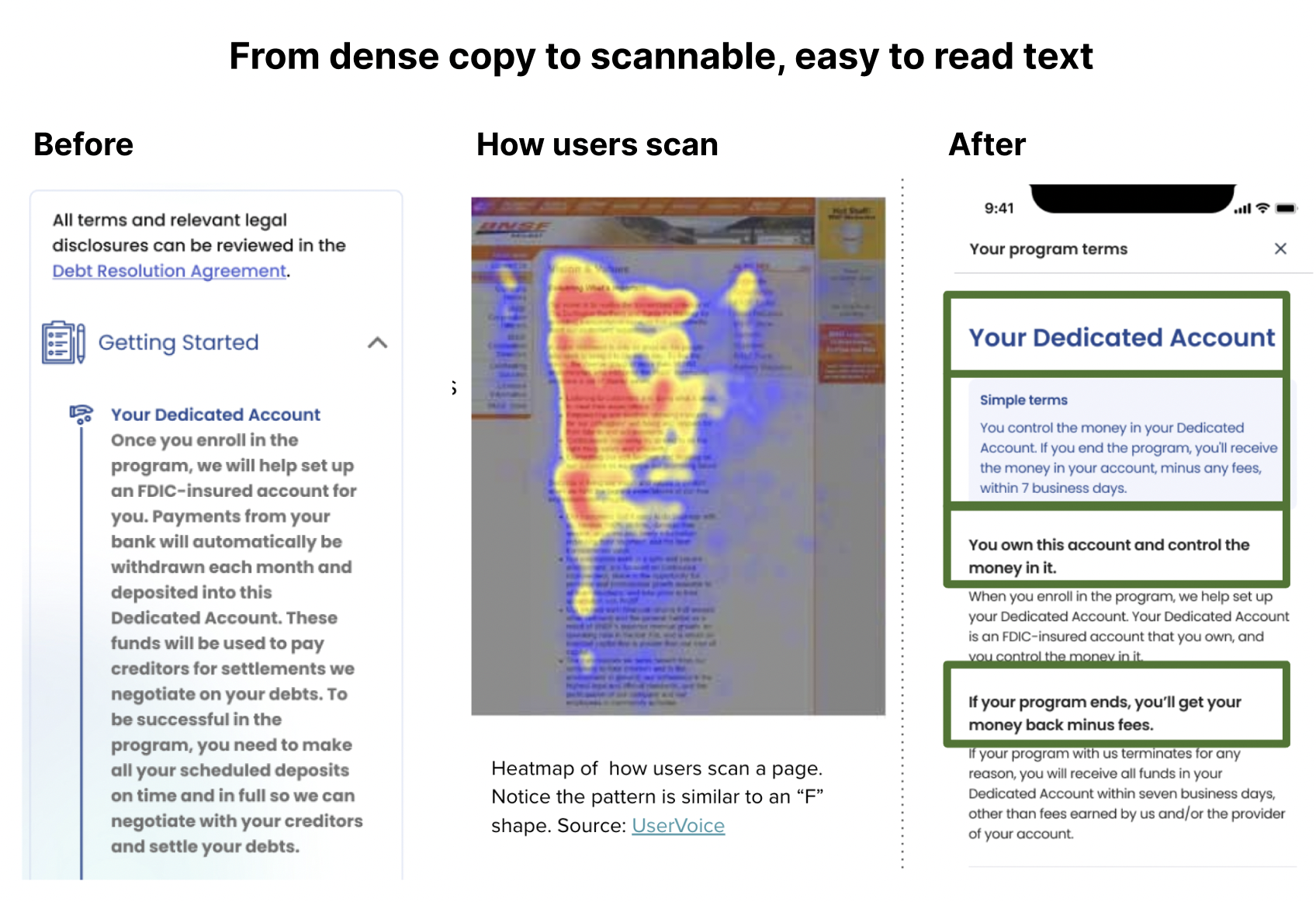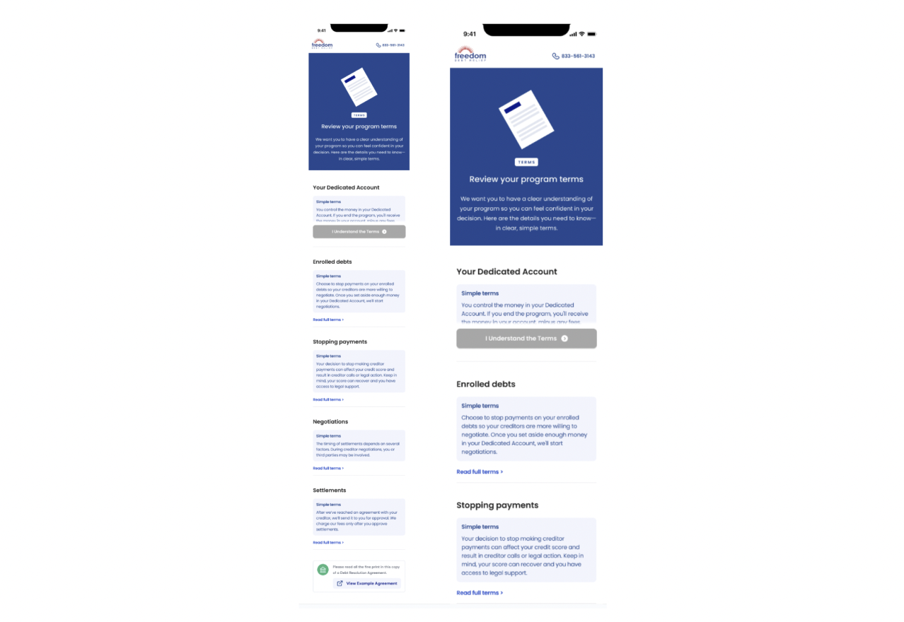 •Addressed top concerns immediately in the “Simple terms” where users are more likely to scan: summaries and headings