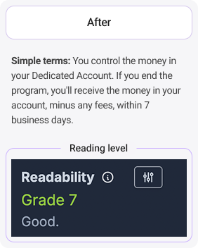 Simplifying the Terms page from hard-to read legal jargon to plain language—dropping it 6 grade reading levels so the average person can understand it.
